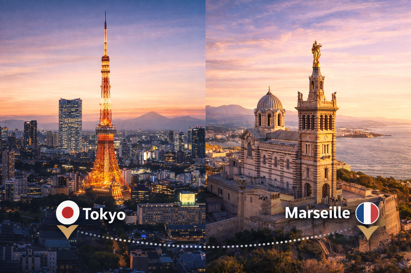 La distance entre Tokyo et Marseille dépasse 9 700 kilomètres. Le transport est exclusivement aérien.